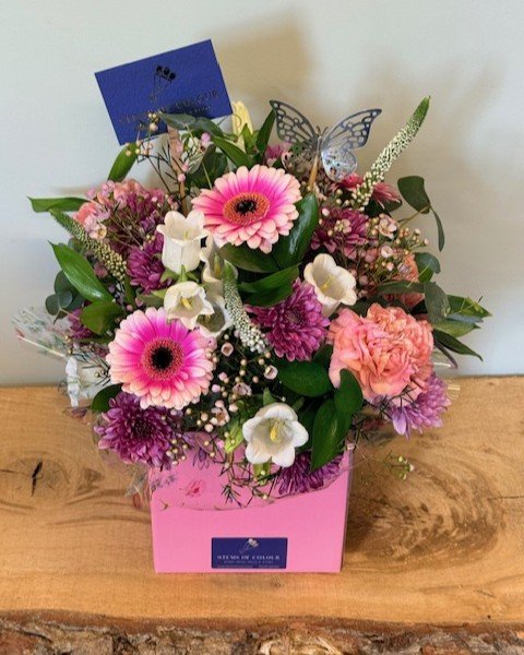 An elegant floral arrangement beautifully presented in a stylish gift box, featuring fresh seasonal blooms in harmonious colours. Thoughtfully designed to delight the senses, this charming display makes the perfect gift for birthdays, celebrations, or simply to brighten someone’s day.