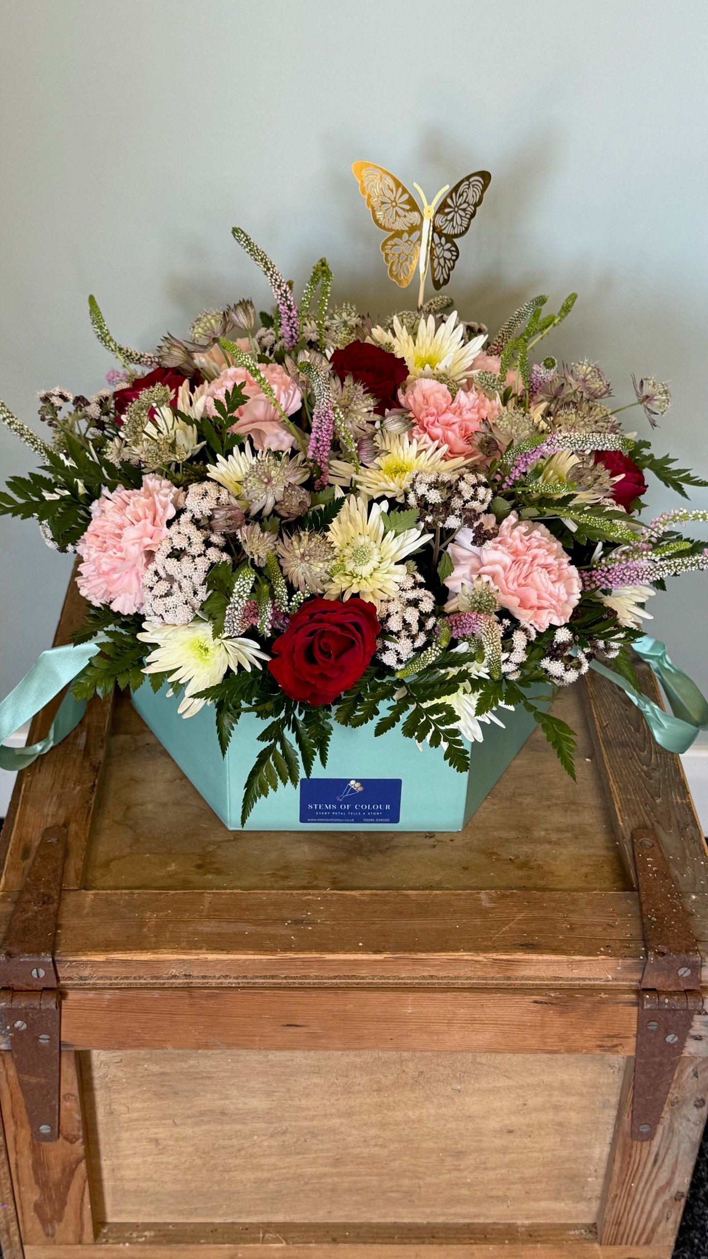 A stunning hexagon box filled with a delicate mix of blooms, artfully arranged for an elegant, eye-catching display. Flower types and colours may vary seasonally, but we promise a handcrafted arrangement perfect for gifting or brightening any day.
