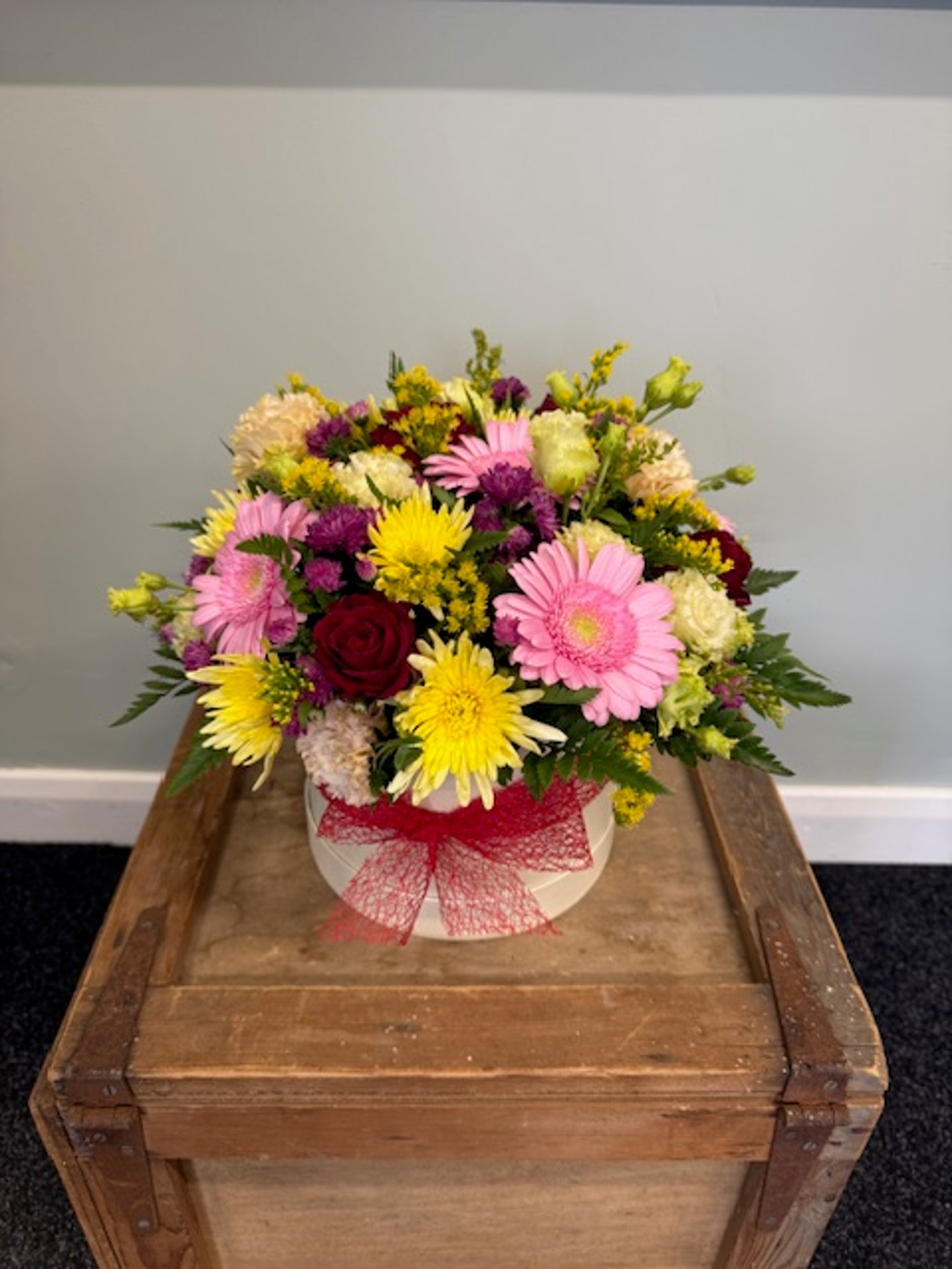 A burst of colour in a box! Vibrant, joyful blooms are artfully arranged in a stunning hat box — perfect for brightening any day. Flower types and colours may vary seasonally, but we guarantee a stunning, handcrafted arrangement you’ll adore.