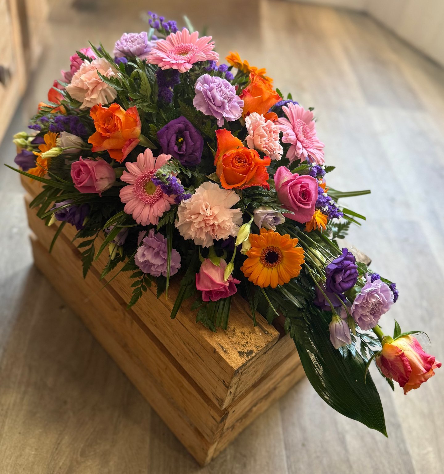 A vibrant single ended spray bursting with colourful seasonal blooms, arranged to create a stunning and uplifting tribute. This eye-catching display is a heartfelt way to celebrate a joyful life and express loving memories.