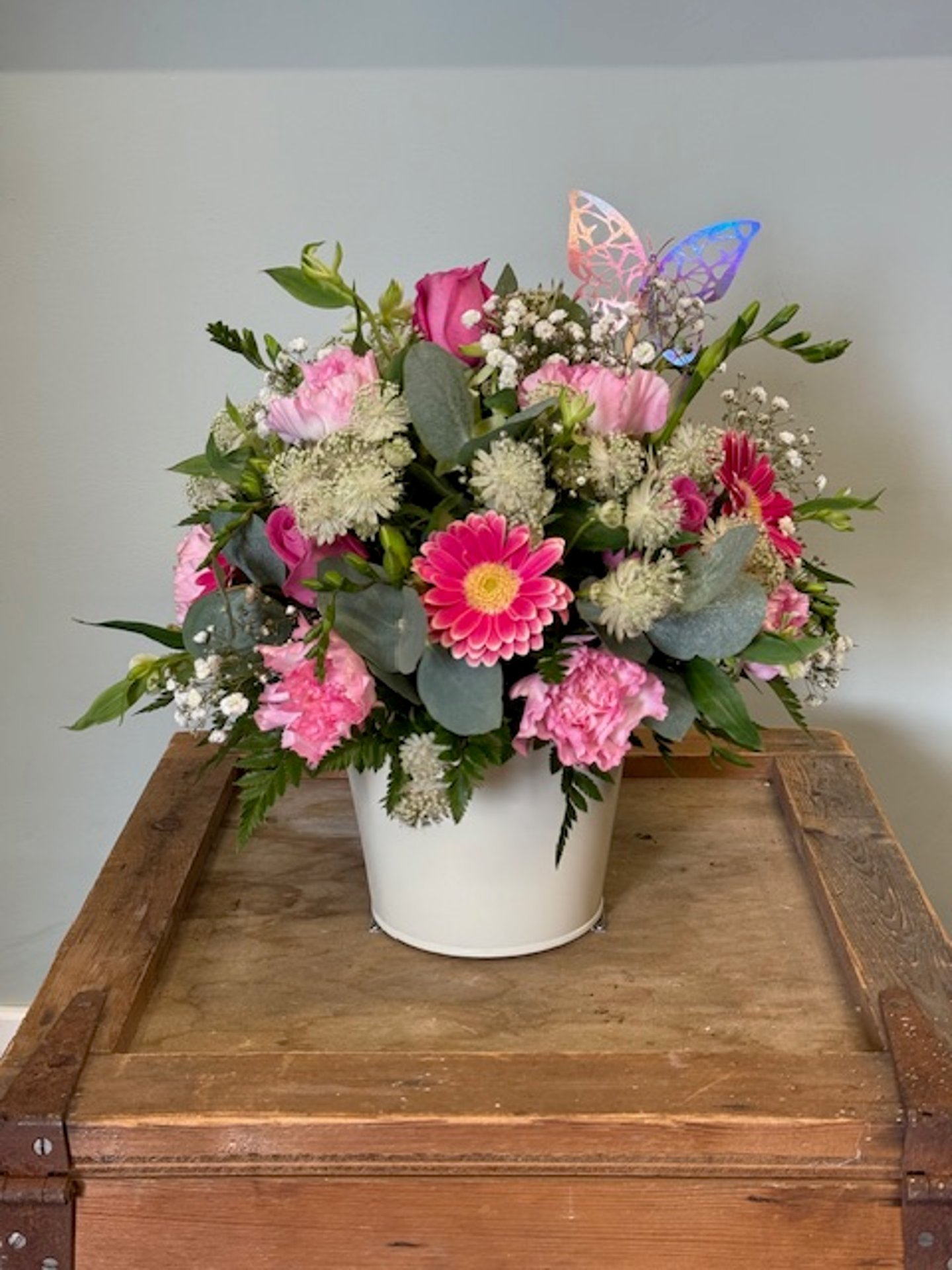 This cheerful little pot is a sweet delight — packed with pink blooms and lush green foliage to brighten any day. Flower types and colours may vary with the season, but we promise a stunning, handcrafted arrangement you’ll adore.