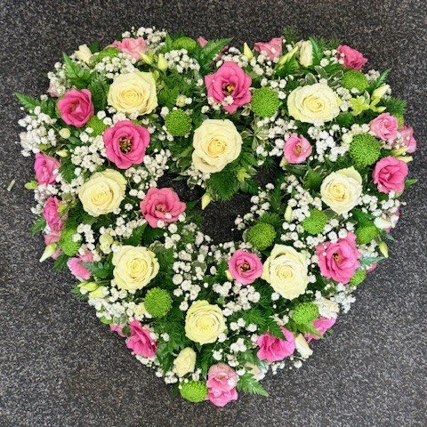 A floral loose open heart, softly arranged with a mix of blooms, symbolises open love and heartfelt remembrance. Its natural, flowing design offers a gentle tribute, reflecting warmth, compassion, and the everlasting bond with a loved one.