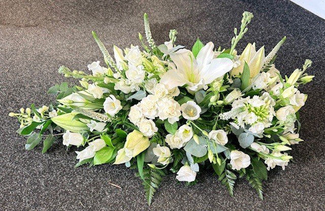 A graceful neutral spray tribute featuring soft ivory, white and delicate foliage. Thoughtfully arranged with elegant blooms to convey love, remembrance, and quiet strength. A timeless and respectful floral gesture to honour and celebrate a cherished life.