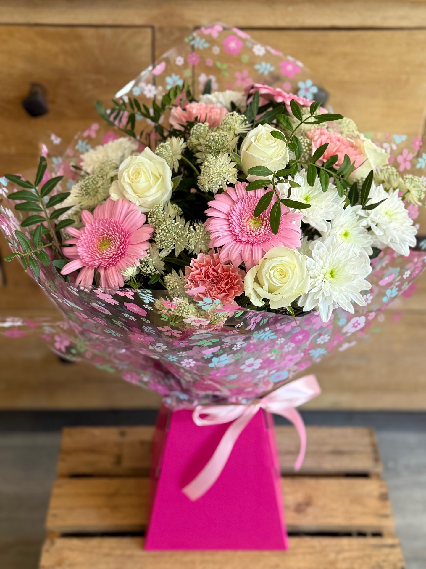A soft symphony of pink, cream, and white blooms, delicately arranged to evoke elegance and warmth. Flower types and colours may vary seasonally, but we promise a handcrafted bouquet perfect for gifting or brightening any special day.