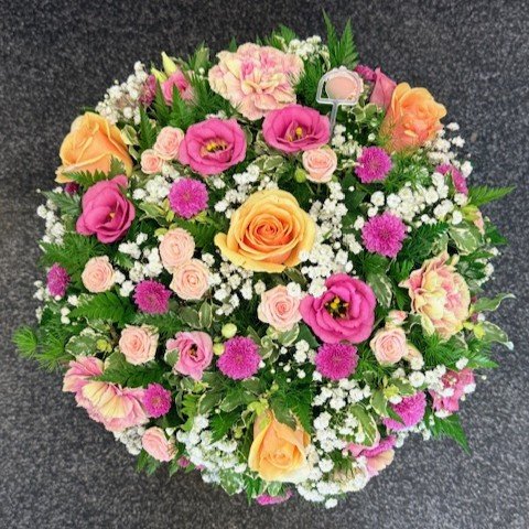 A delicate pastel posy tribute featuring soft shades of pink and peach blooms, thoughtfully arranged to create a gentle and elegant farewell. This charming design symbolises love, peace, and cherished memories, offering a tender and graceful tribute.