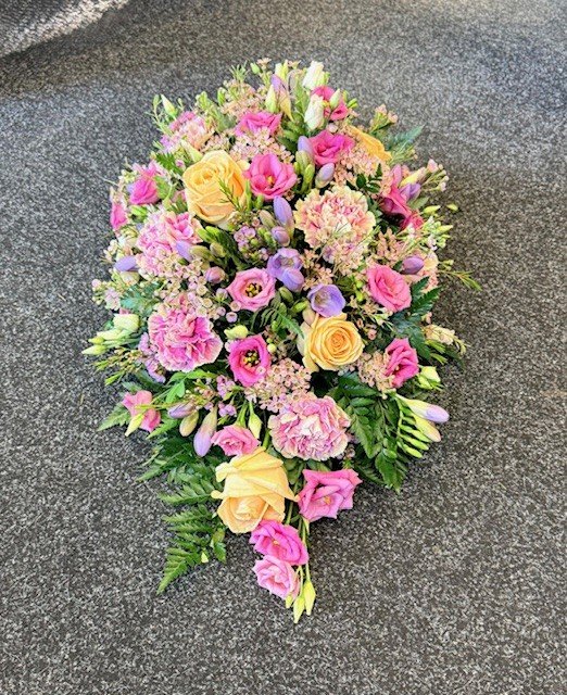 A graceful single-ended spray in soft pastel tones, thoughtfully arranged to convey peace and remembrance. Gently scented blooms in delicate hues offer comfort and serenity, creating a heartfelt tribute that honours a loved one with quiet elegance.