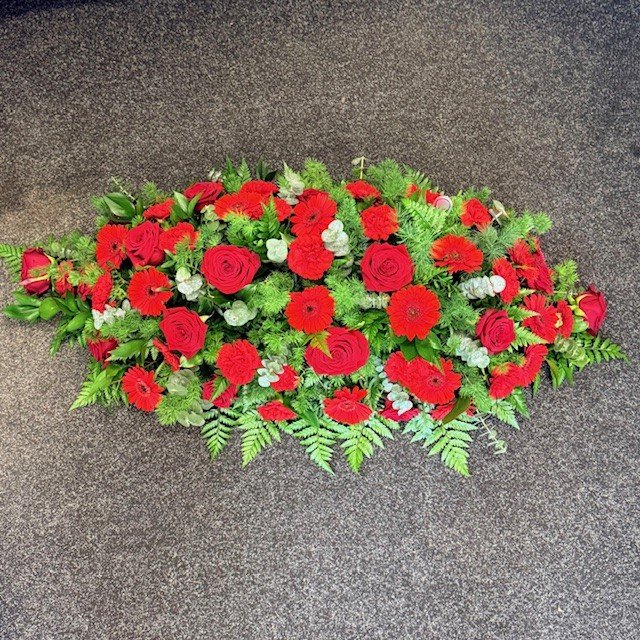 A striking coffin spray of deep red roses, vibrant red gerberas, and rich red carnations, beautifully arranged to create a bold and heartfelt tribute. Symbolising love, respect, and remembrance, this elegant display offers a powerful expression of farewell.
