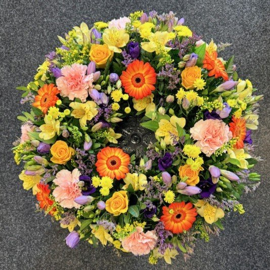 An open wreath bursting with vibrant seasonal flowers, showcasing a lively mix of colours and textures. Delicate blooms and lush greenery intertwine, creating a fresh, eye-catching arrangement that celebrates nature’s beauty and timeless elegance.