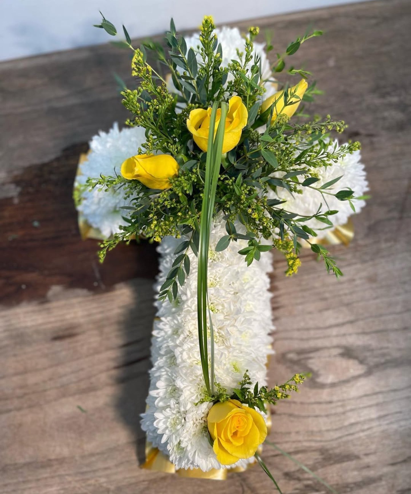 A traditional floral based cross crafted with white chrysanthemums and a delicate spray of fresh flowers. Symbolising faith, love, and peace, this meaningful tribute offers a beautiful way to honour and remember a cherished life.