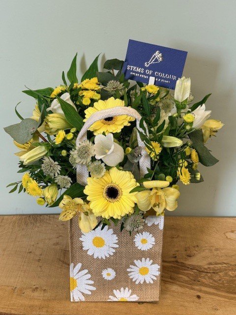 A charming arrangement in sunny yellow tones, beautifully presented in a rustic jute bag. Filled with fresh seasonal blooms and soft greenery, it brings a warm, cheerful touch, perfect for brightening any space. Flowers and foliage may vary due to availability.